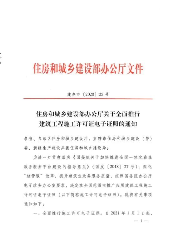 住建部辦公廳:全面推行建筑工程施工許可證電子證照!